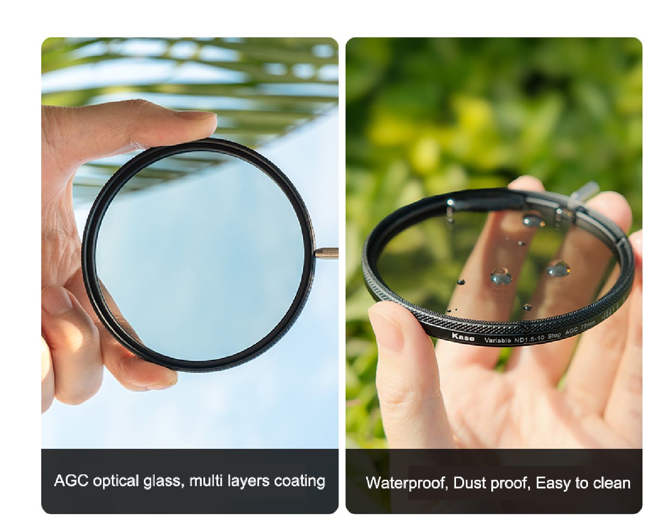 Kase Variable ND AGC VND 1,5–10 Steg är tillverkat av AGC optiskt glas, med avancerad och dubbelsidig Multicoating (8+4 lager) med en yta som både är vattenavstötande och lätt att torka av och hålla ren.